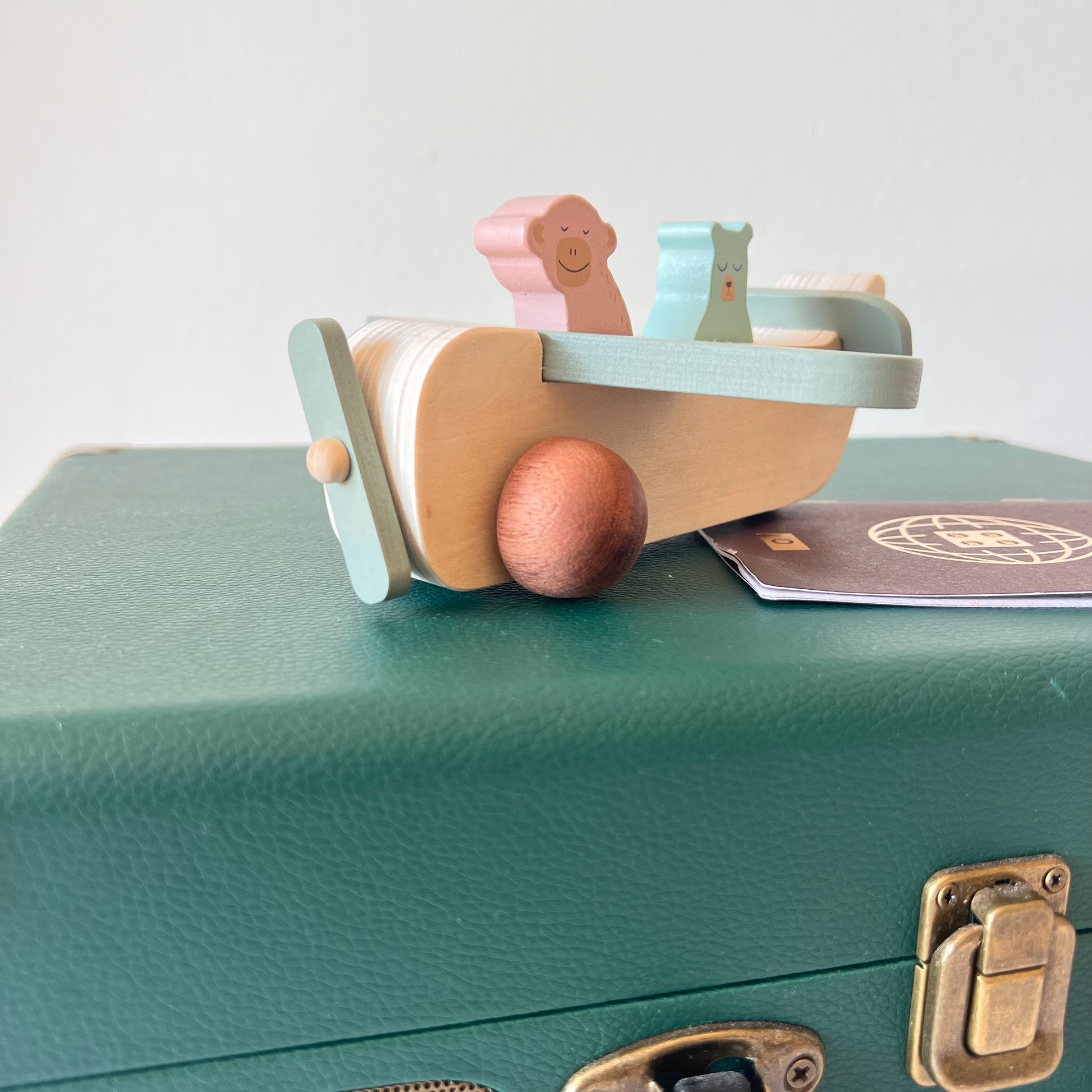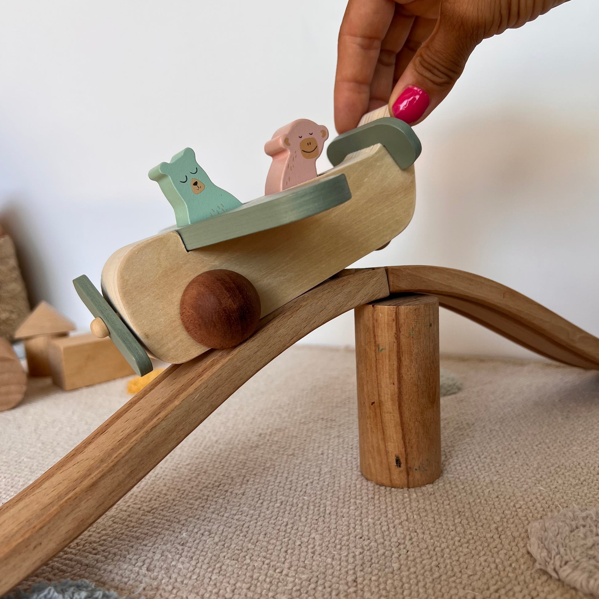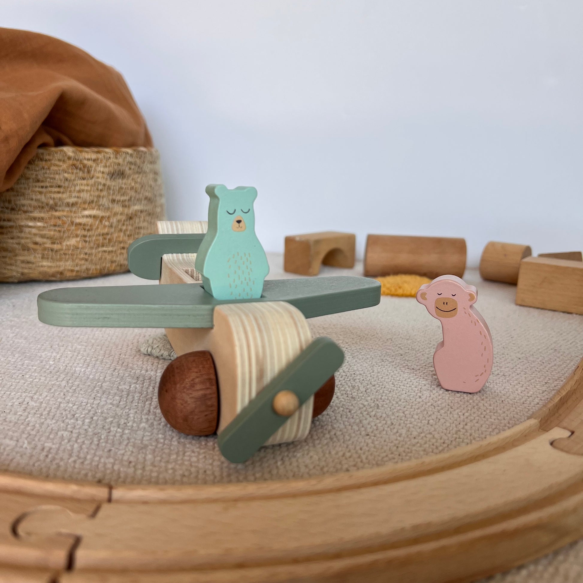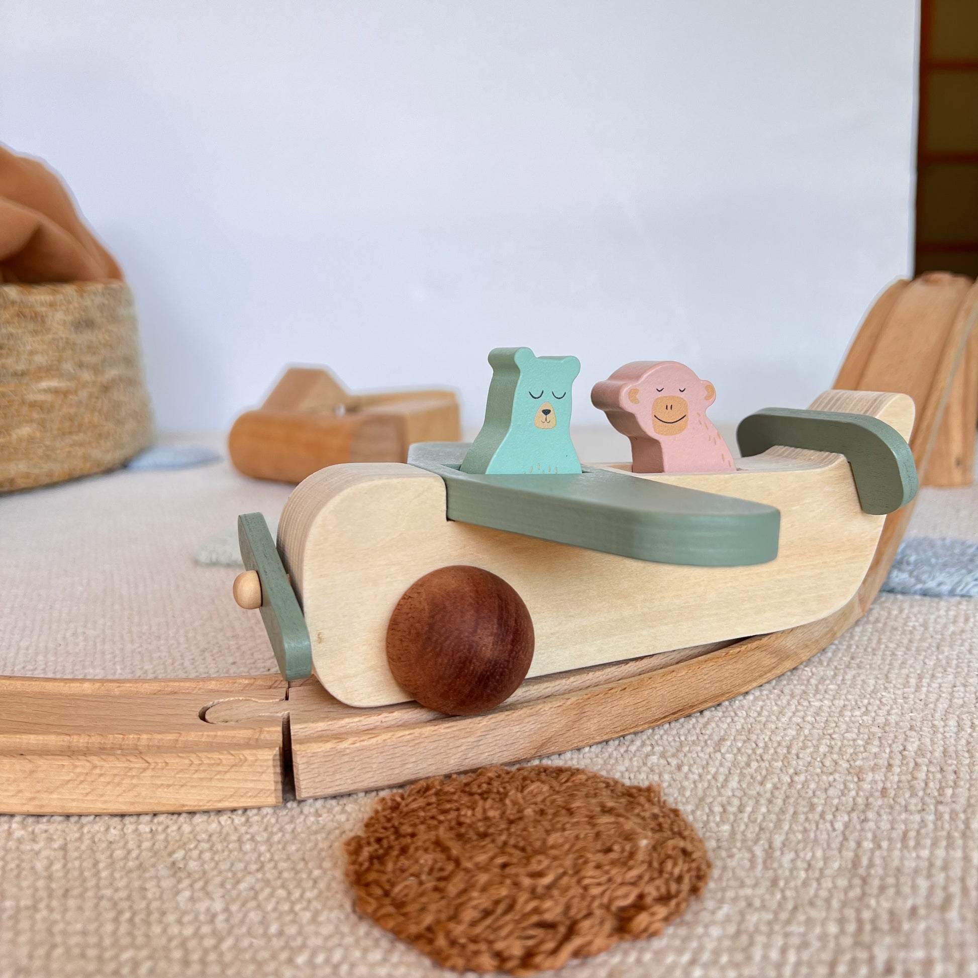 Este encantador avión de madera es perfecto para las pequeñas manos curiosas. Con un diseño suave y redondeado, incluye dos adorables personajes que viajan en la cabina. Fabricado en madera natural con detalles en tonos pastel, estimula la imaginación, la motricidad fina y el juego simbólico.