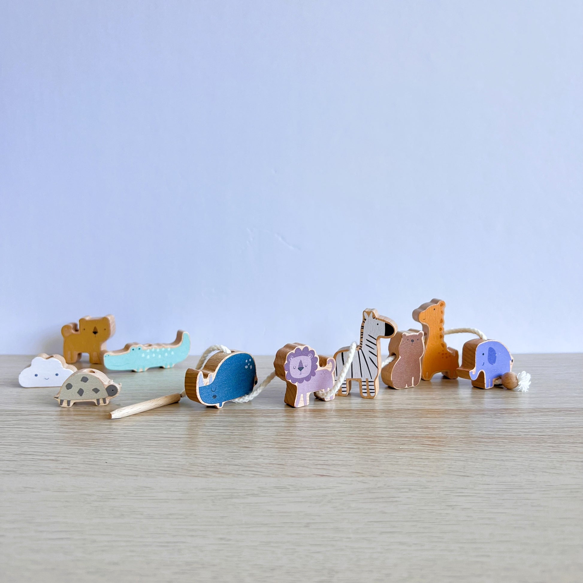 Este completo juego 2 en 1 de animales de madera es perfecto para desarrollar habilidades motrices, coordinación y concentración en niños pequeños. Consta de una divertida base de equilibrio para apilar y de una cuerda para ensartar las figuras, permitiendo múltiples formas de juego bajo el enfoque Montessori.