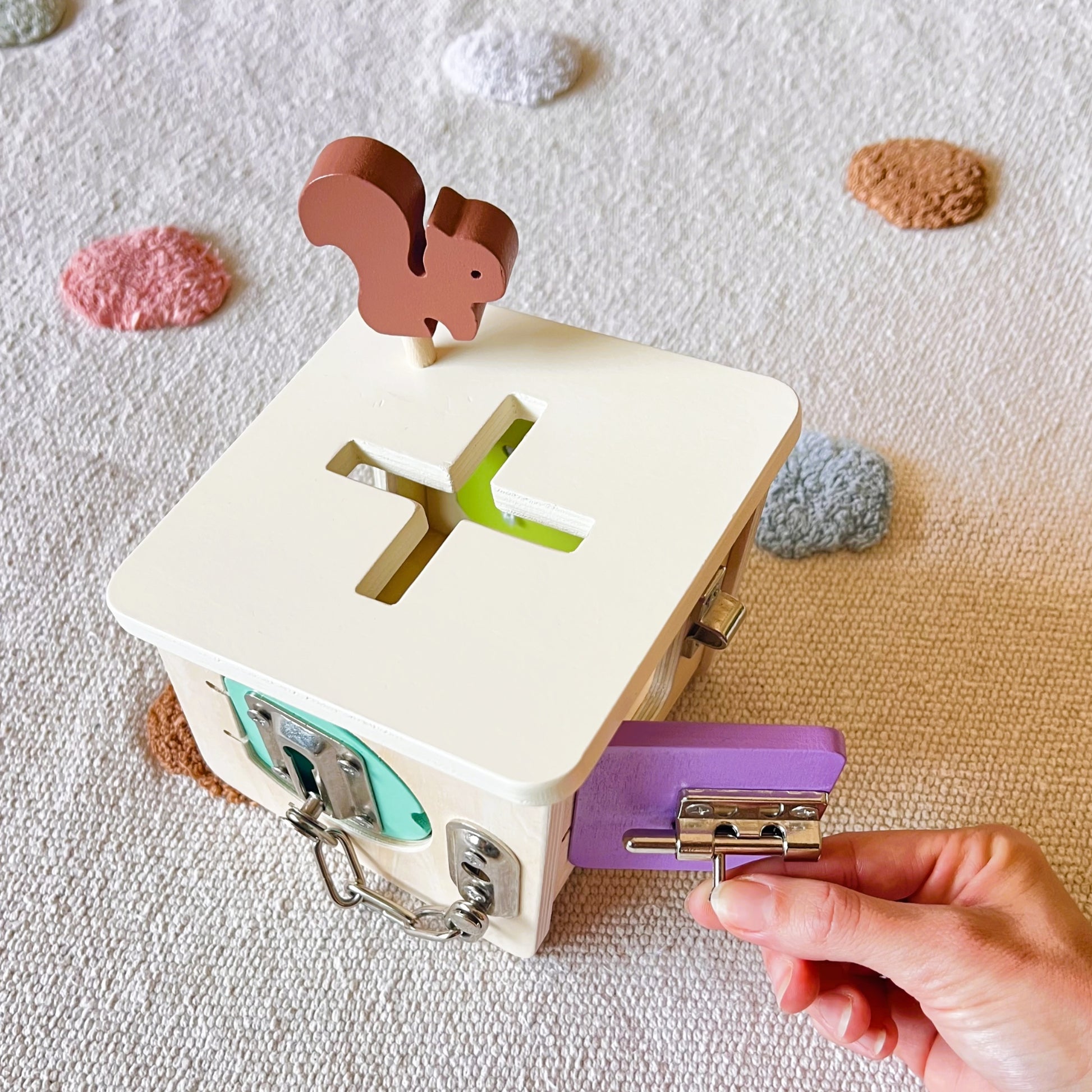 Esta encantadora caja sensorial de madera está diseñada bajo los principios Montessori para fomentar el aprendizaje autónomo a través del juego. Con cerraduras reales, figuras geométricas coloridas y una ventana de observación, permite al niño explorar texturas, mecanismos y formas, desarrollando habilidades cognitivas y motoras de forma divertida y segura.