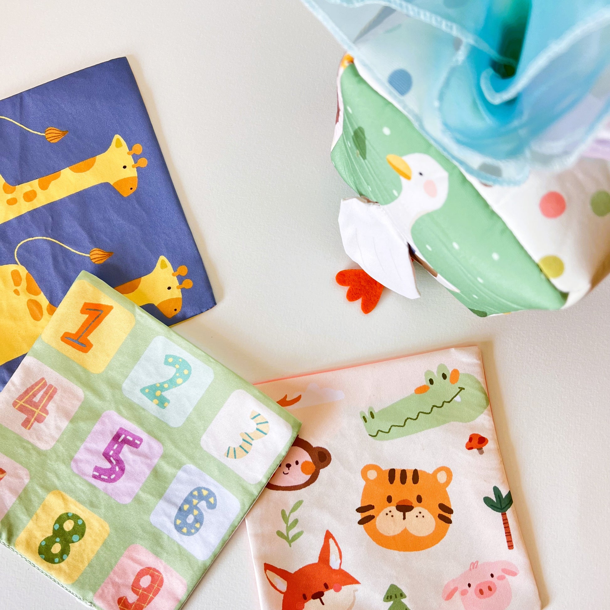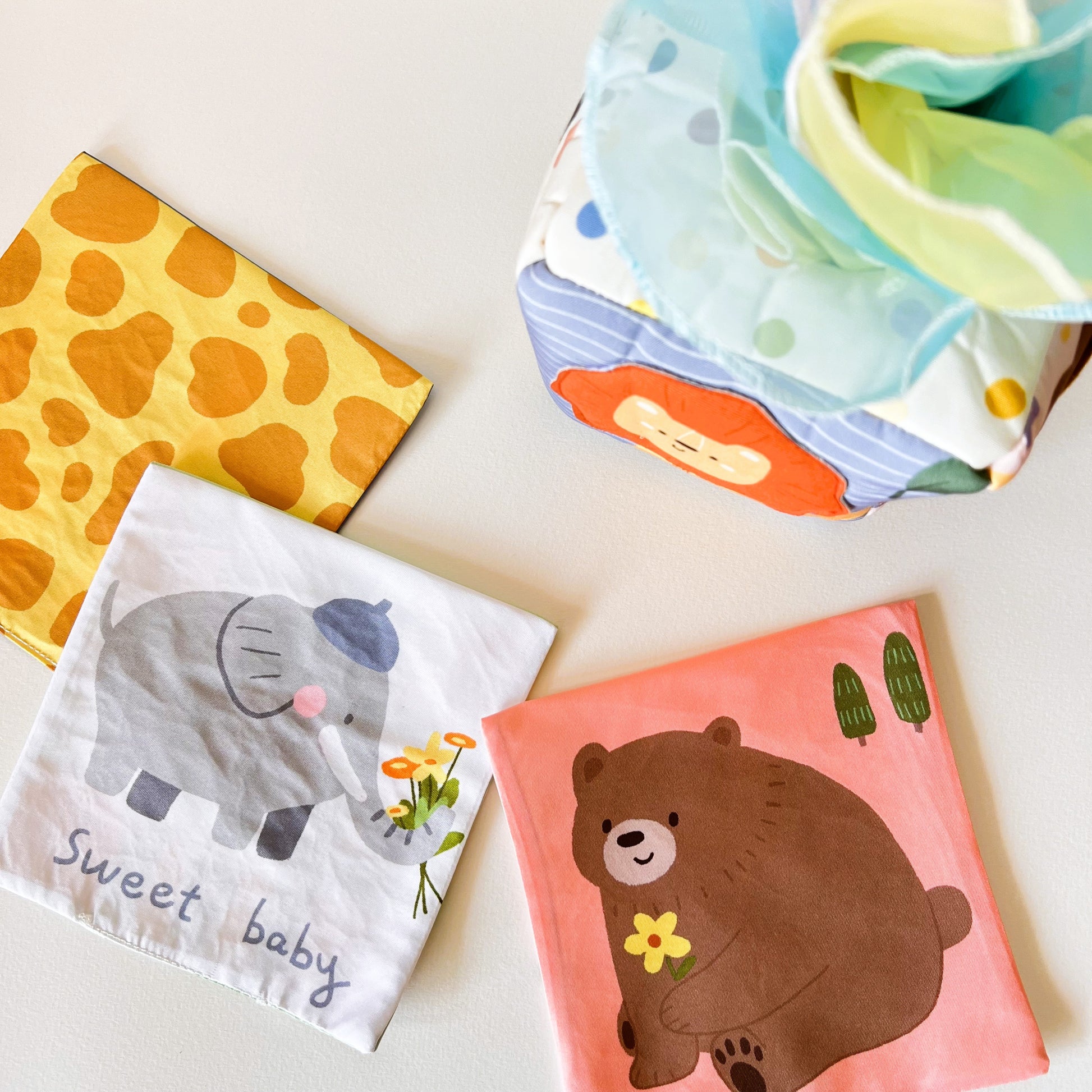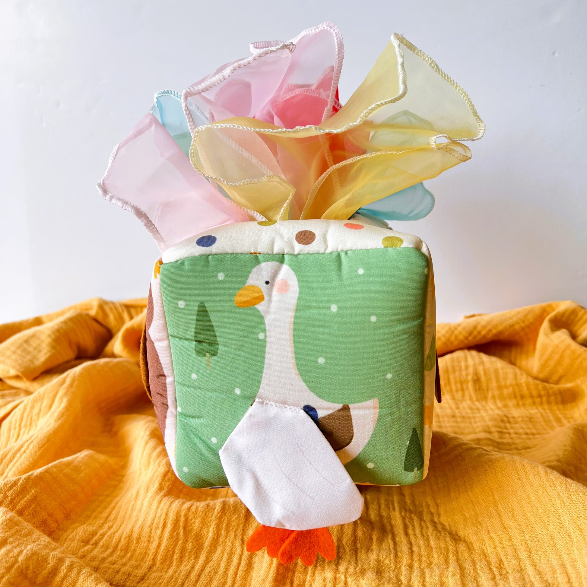 Esta suave cajita sensorial está inspirada en el clásico gesto de sacar pañuelos de una caja, pero adaptada para el juego seguro y estimulante de bebés. Incluye múltiples pañuelos de colores vivos y texturas suaves que invitan a explorar, tirar, meter y volver a empezar. Además, los laterales muestran simpáticos animalitos que acompañan el descubrimiento. Perfecto para unas manitos curiosas, el desarrollo de la motricidad fina y la coordinación mano-ojo de los primeros meses.