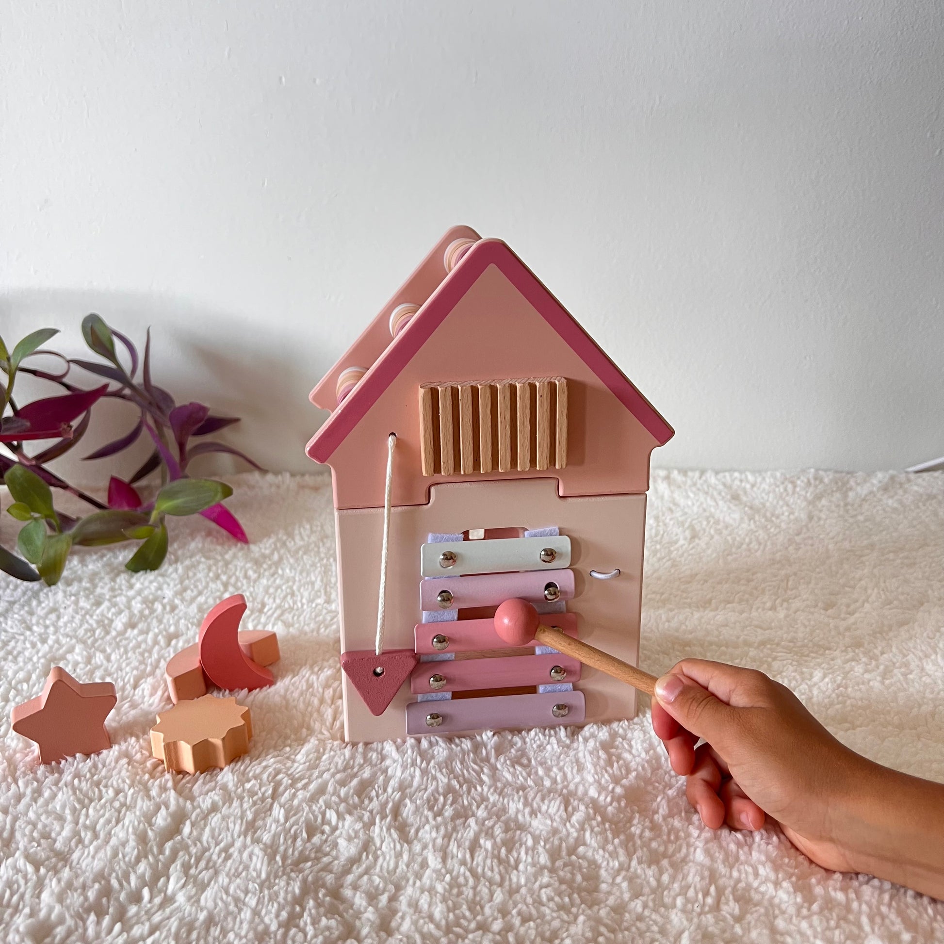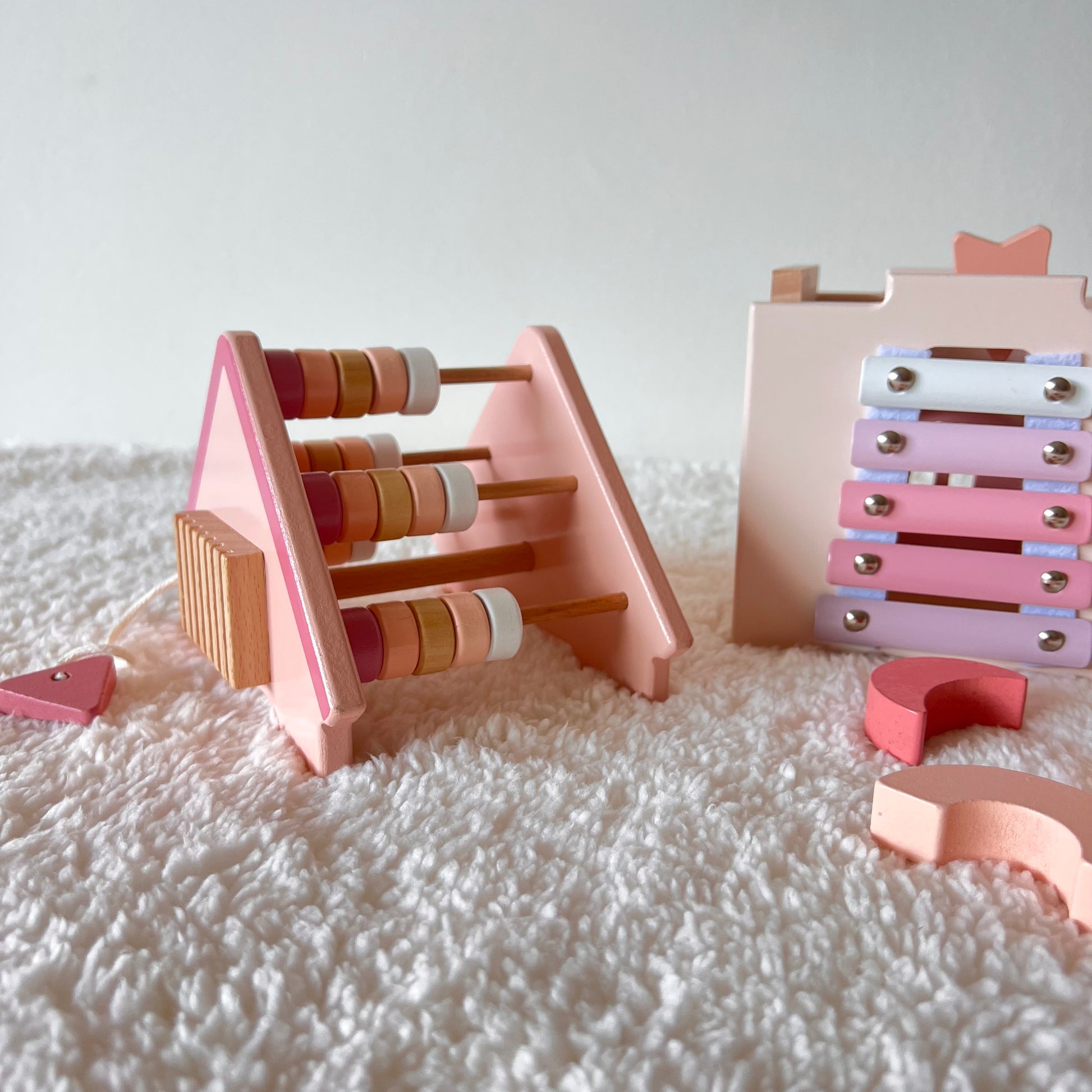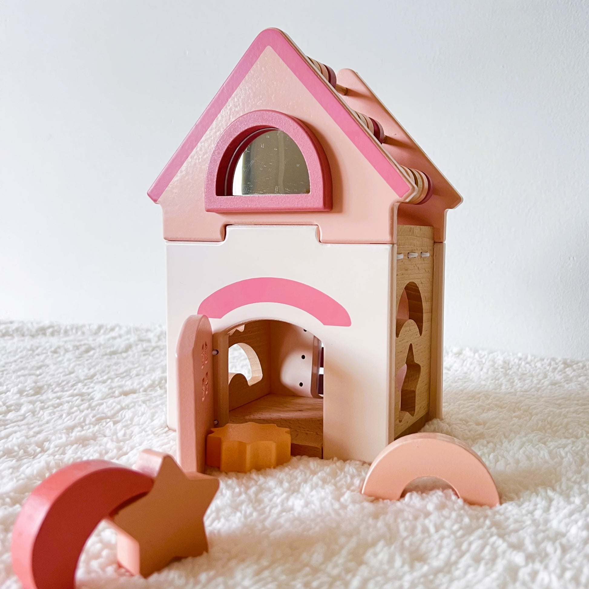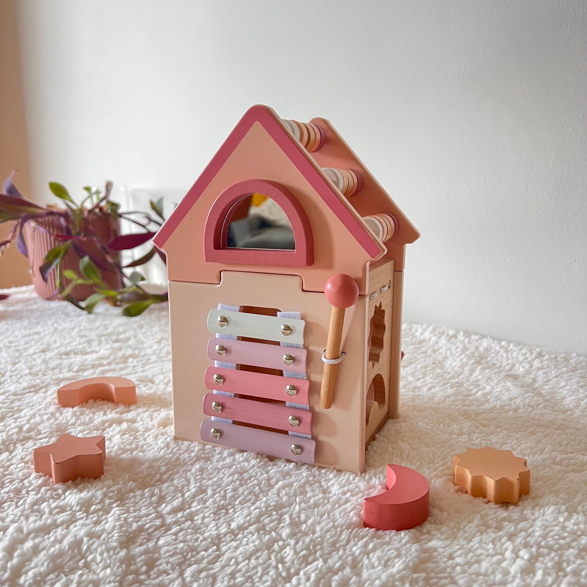 Con su diseño en tonos rosa pastel, es perfecto tanto como juguete educativo como elemento decorativo en espacios infantiles.