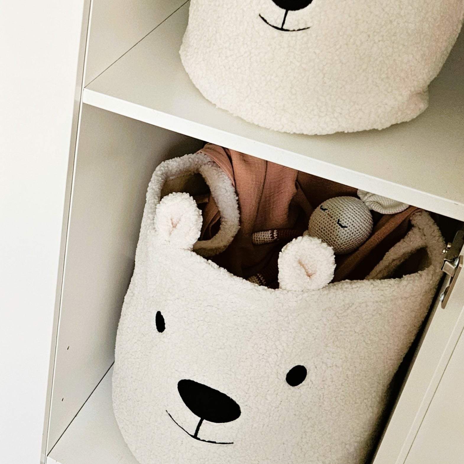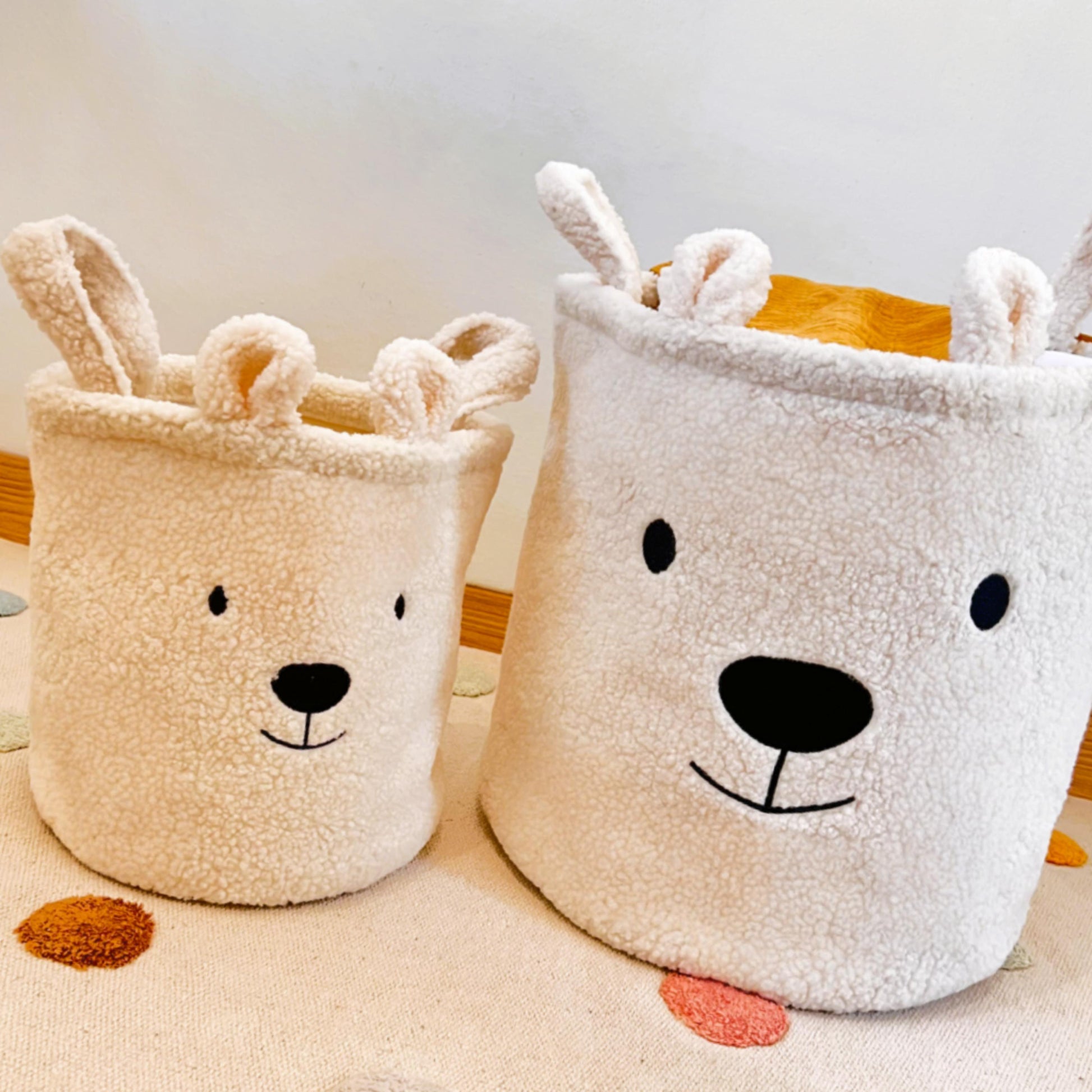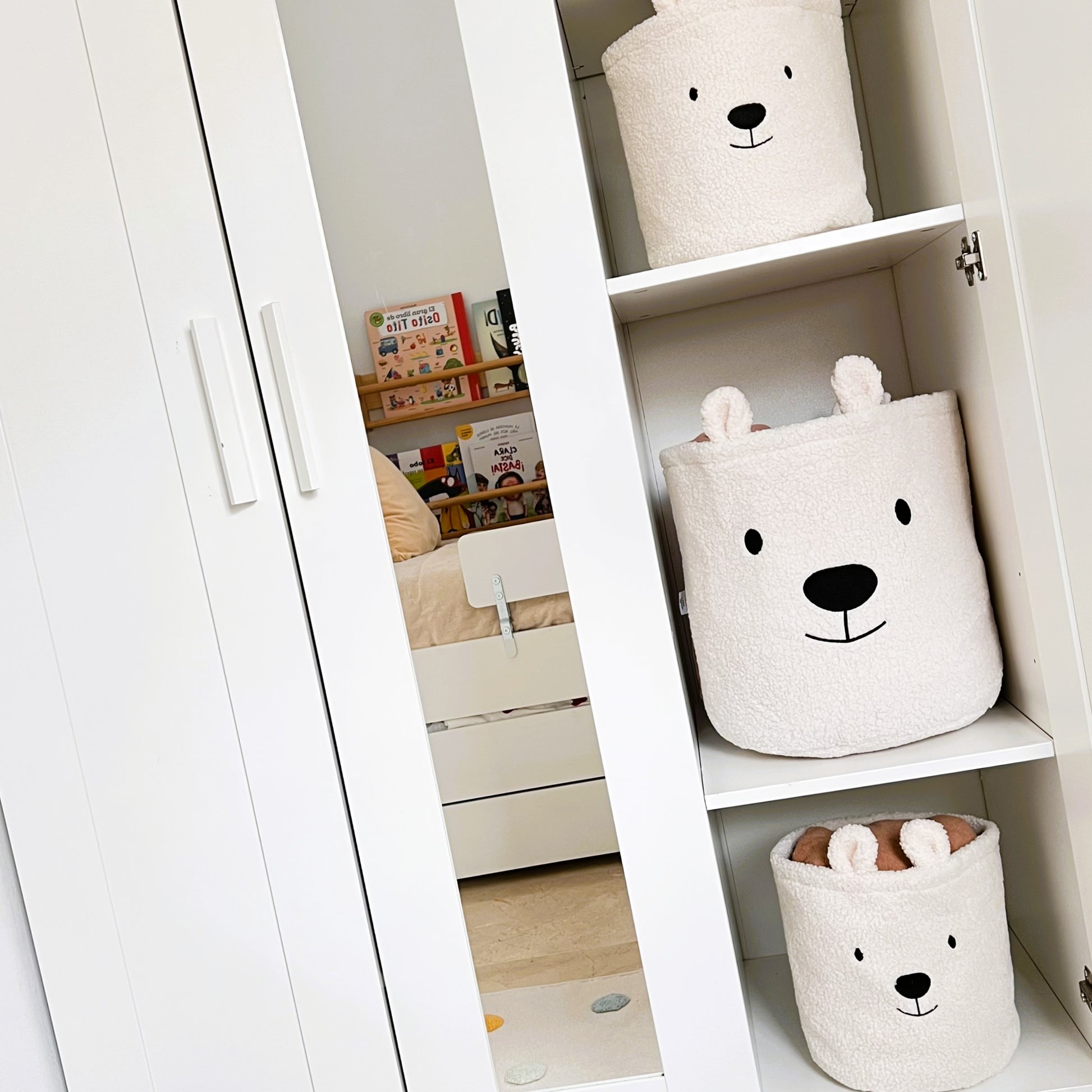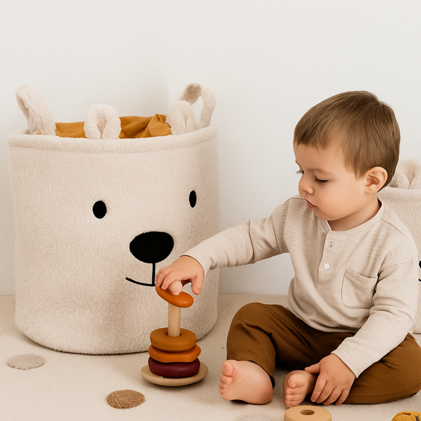 Cesto organizador con diseño de osito, perfecto para guardar juguetes, ropita o accesorios del bebé. Suave, resistente y con estilo natural.