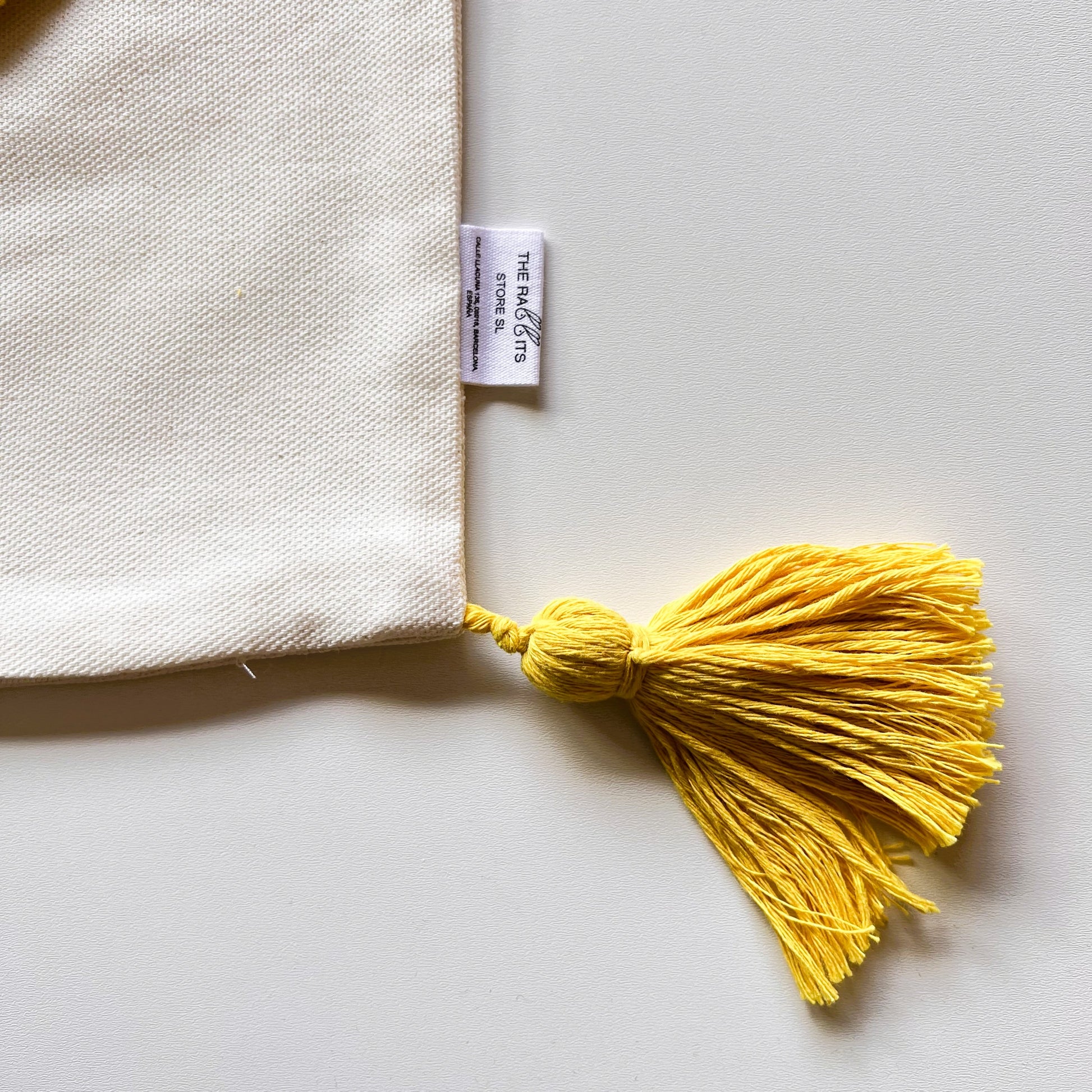 Confeccionada en poliéster suave y duradero, presenta un bordado con una luna amarilla y una estrella rosada, junto con borlas en las esquinas que le dan un toque divertido.