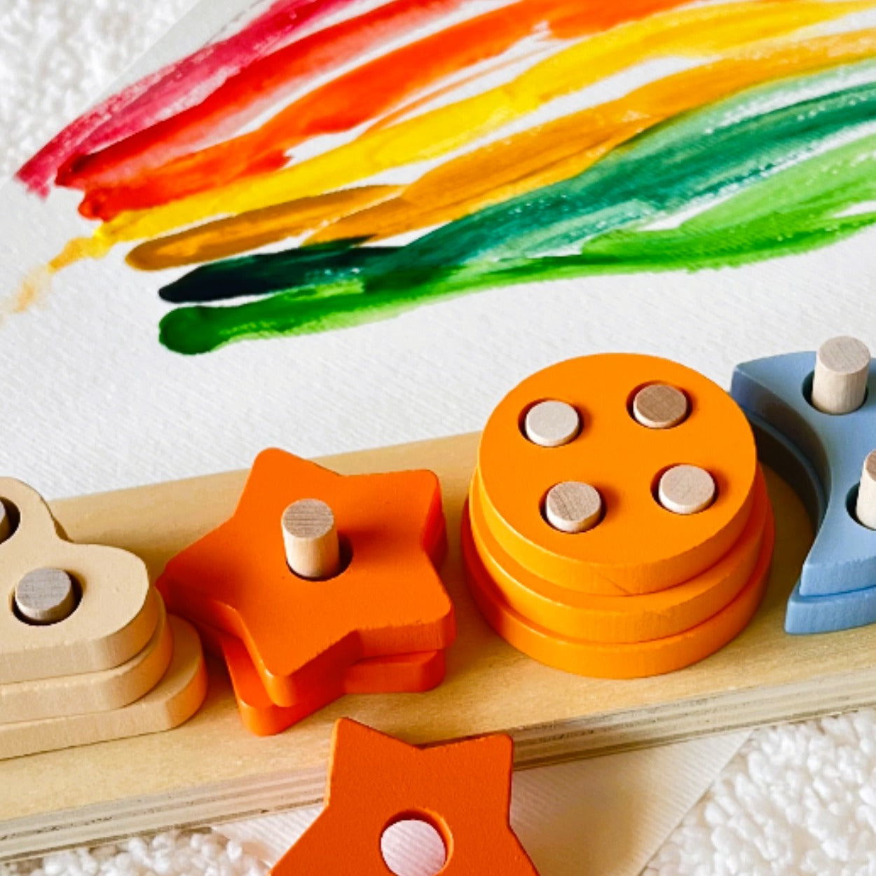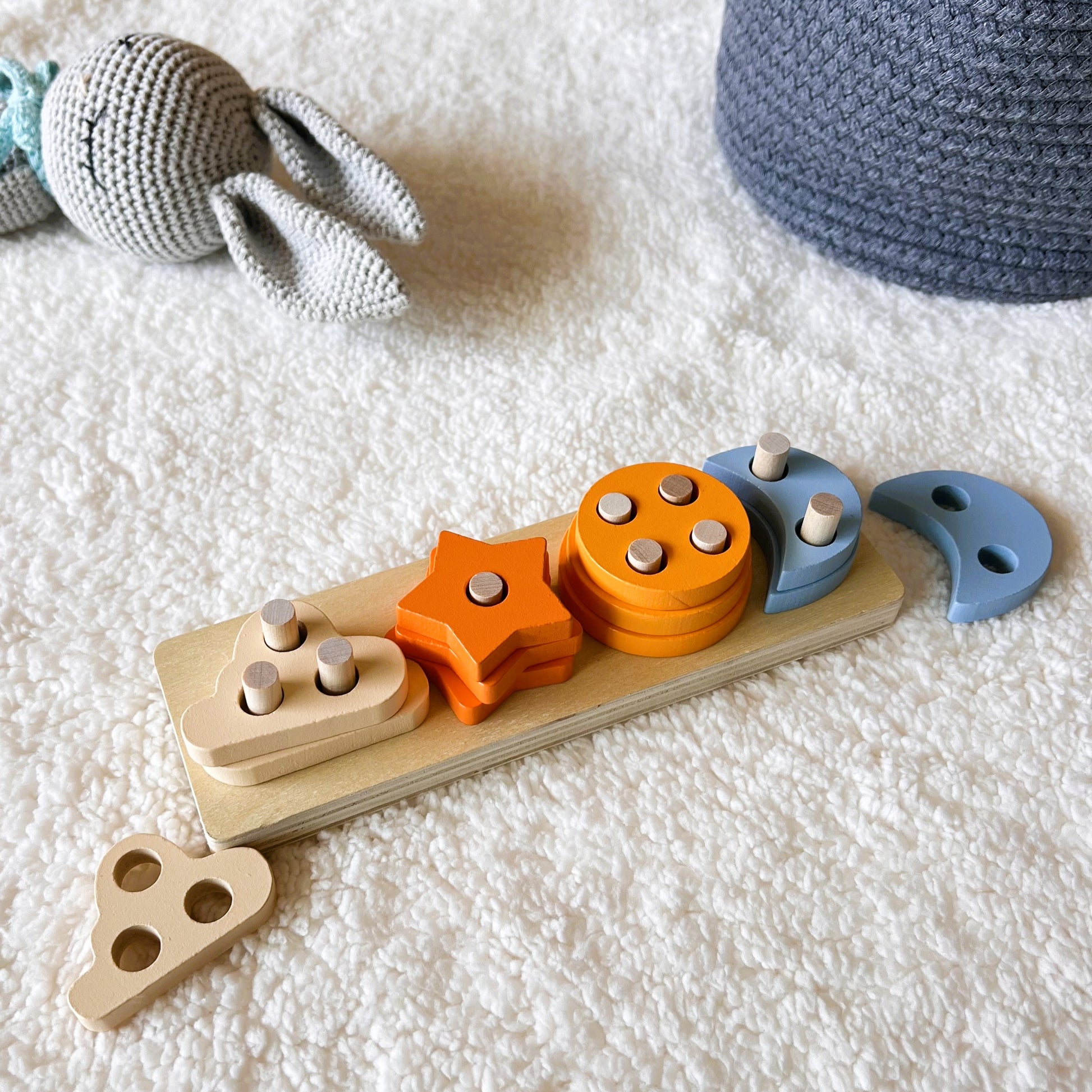 Este encajable de madera con formas inspiradas en el cielo es perfecto para acompañar el desarrollo de los más pequeños. Con piezas de distintos colores, tamaños y posiciones, este juguete estimula la coordinación, la lógica y la motricidad fina de manera divertida y segura.