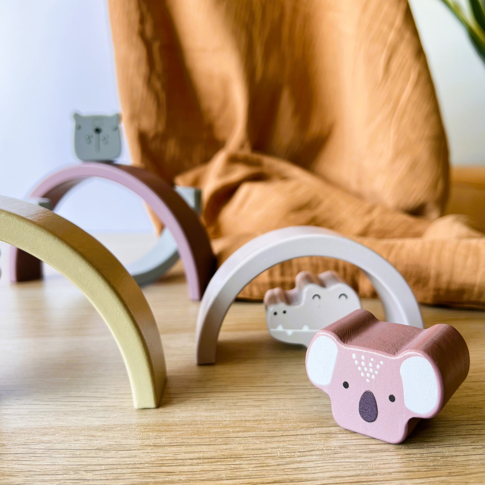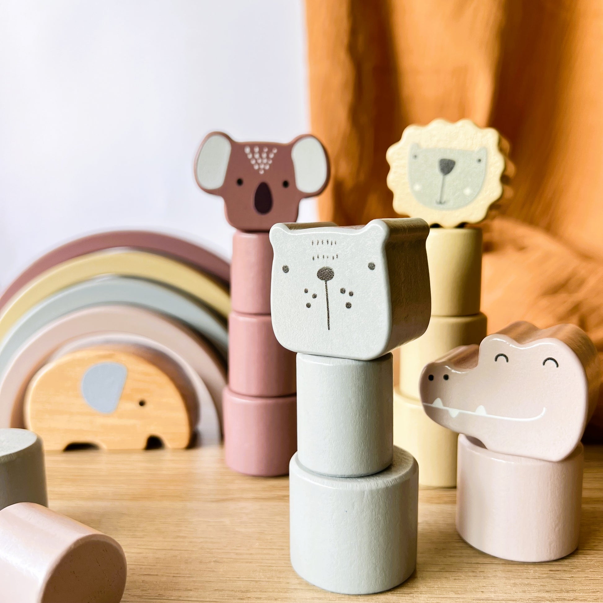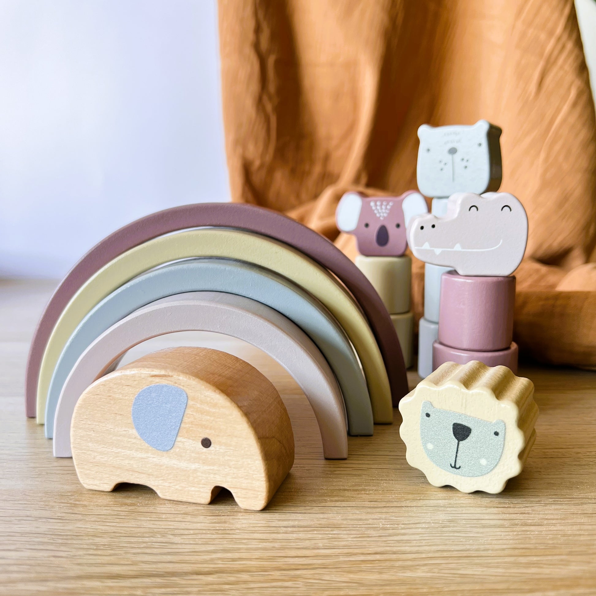 Este encantador set de bloques en tonos pastel combina piezas de apilado, figuras de animales y un arcoíris desmontable para fomentar la creatividad, la lógica y la motricidad. Los niños podrán construir torres, formar animales sobre cilindros y crear estructuras únicas mientras exploran colores, formas y equilibrio.