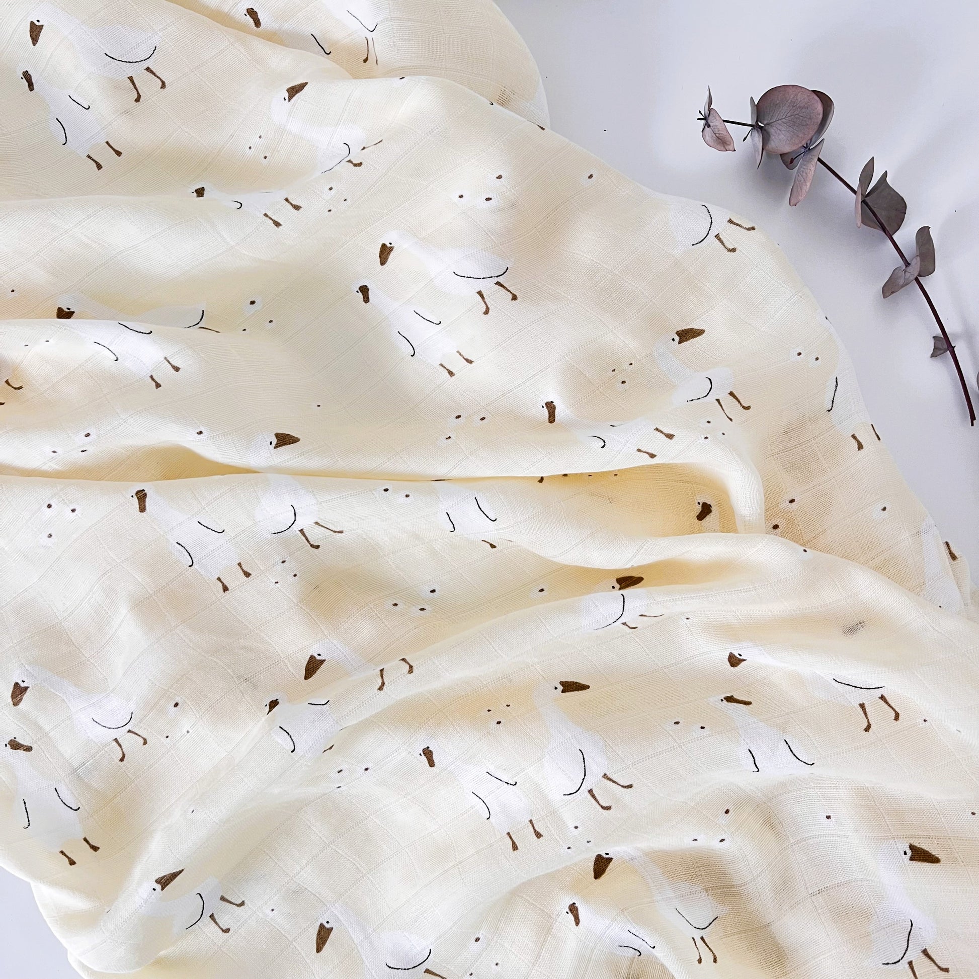 Su estampado de tiernos gansos aporta un toque cálido y natural, perfecto para cunas, cochecitos o como manta auxiliar durante la lactancia.