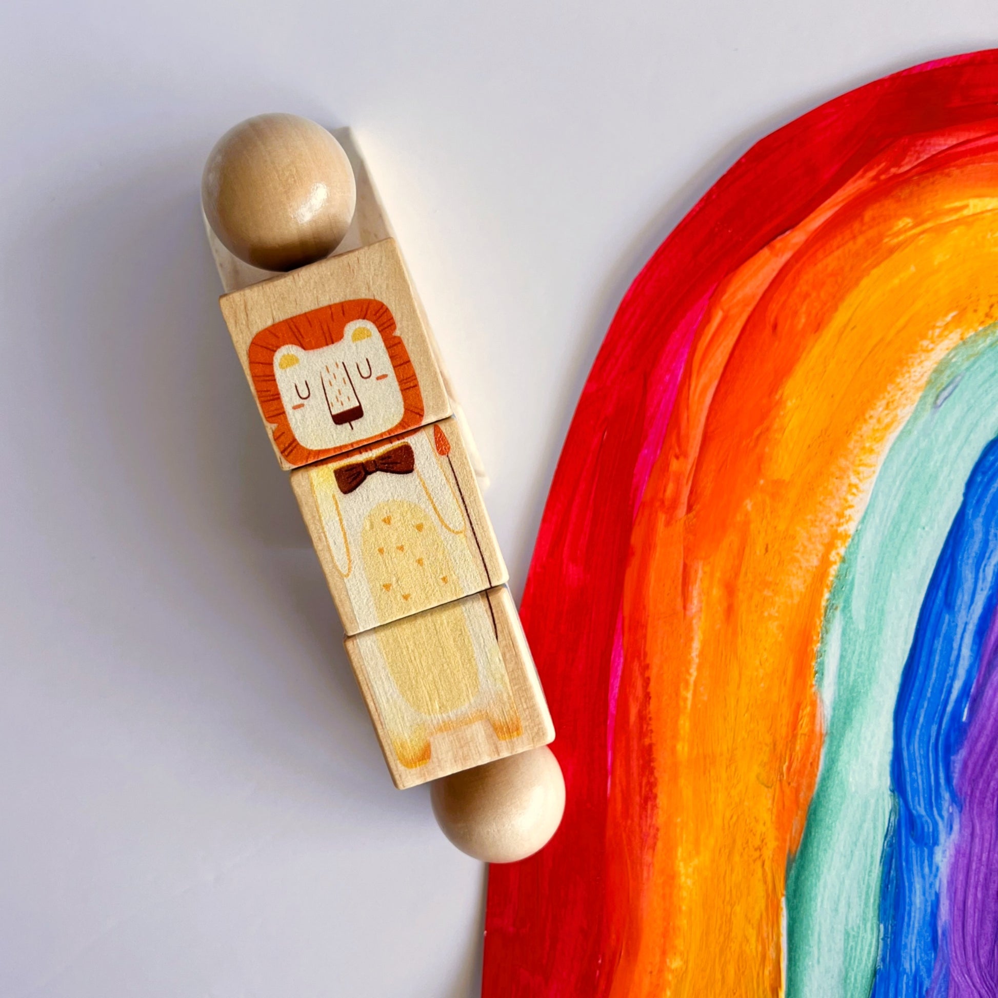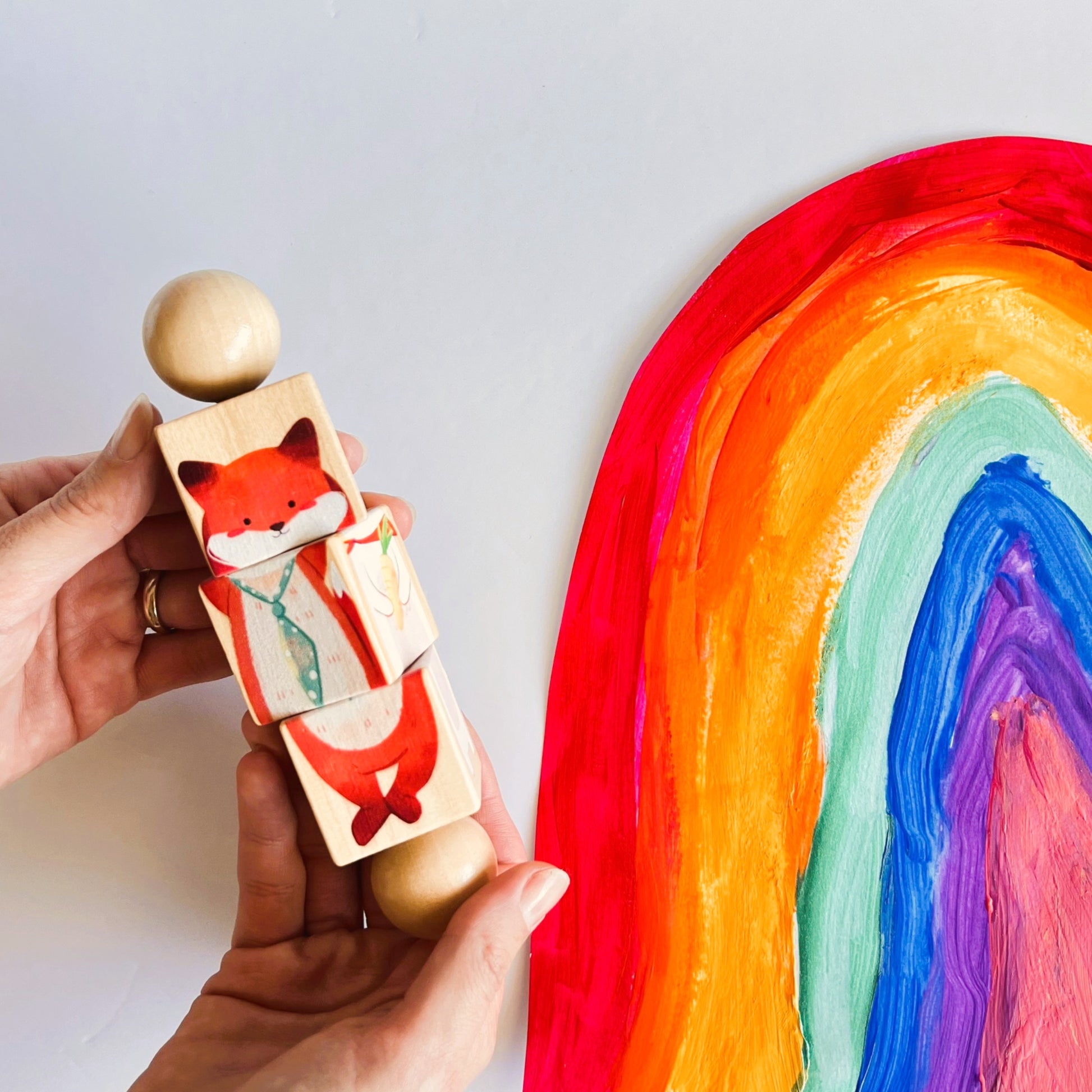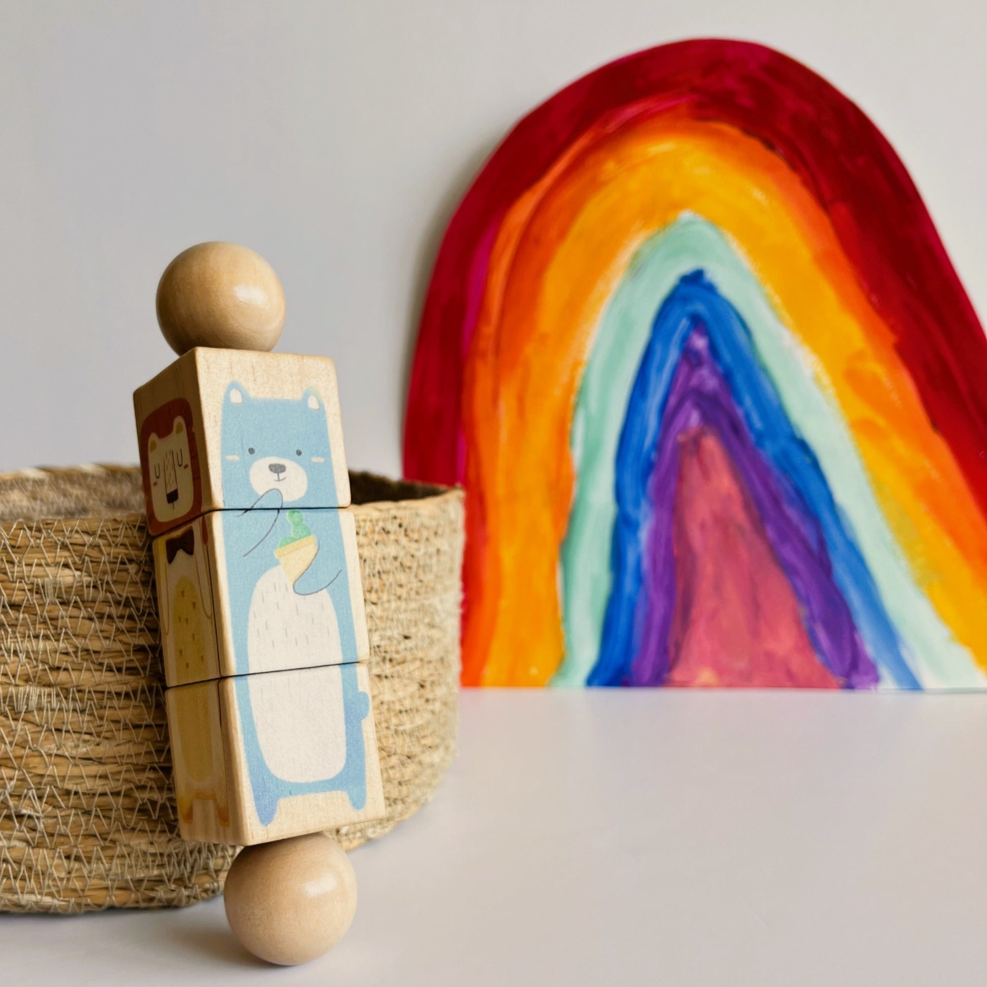 Este encantador set de rompecabezas giratorios está compuesto por tres figuras de animales del bosque: un oso azul con helado, un conejo con zanahoria y un zorro elegante. Cada figura está dividida en dos bloques giratorios sobre un eje central de madera, que el niño puede rotar para formar correctamente la ilustración o mezclar las piezas para crear animales divertidos.