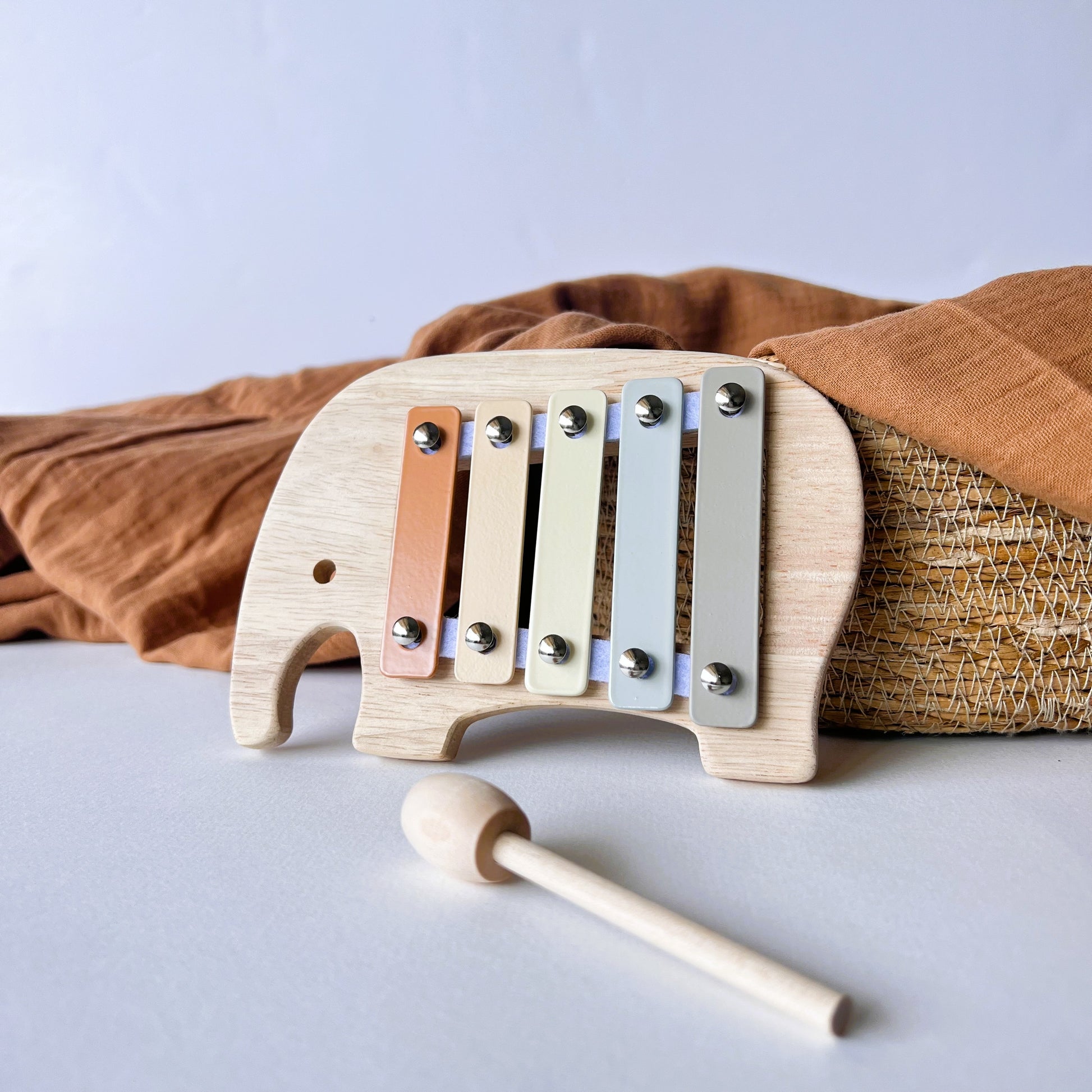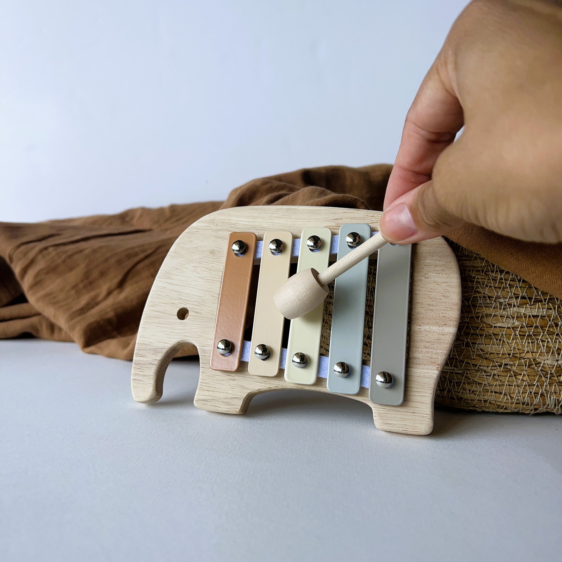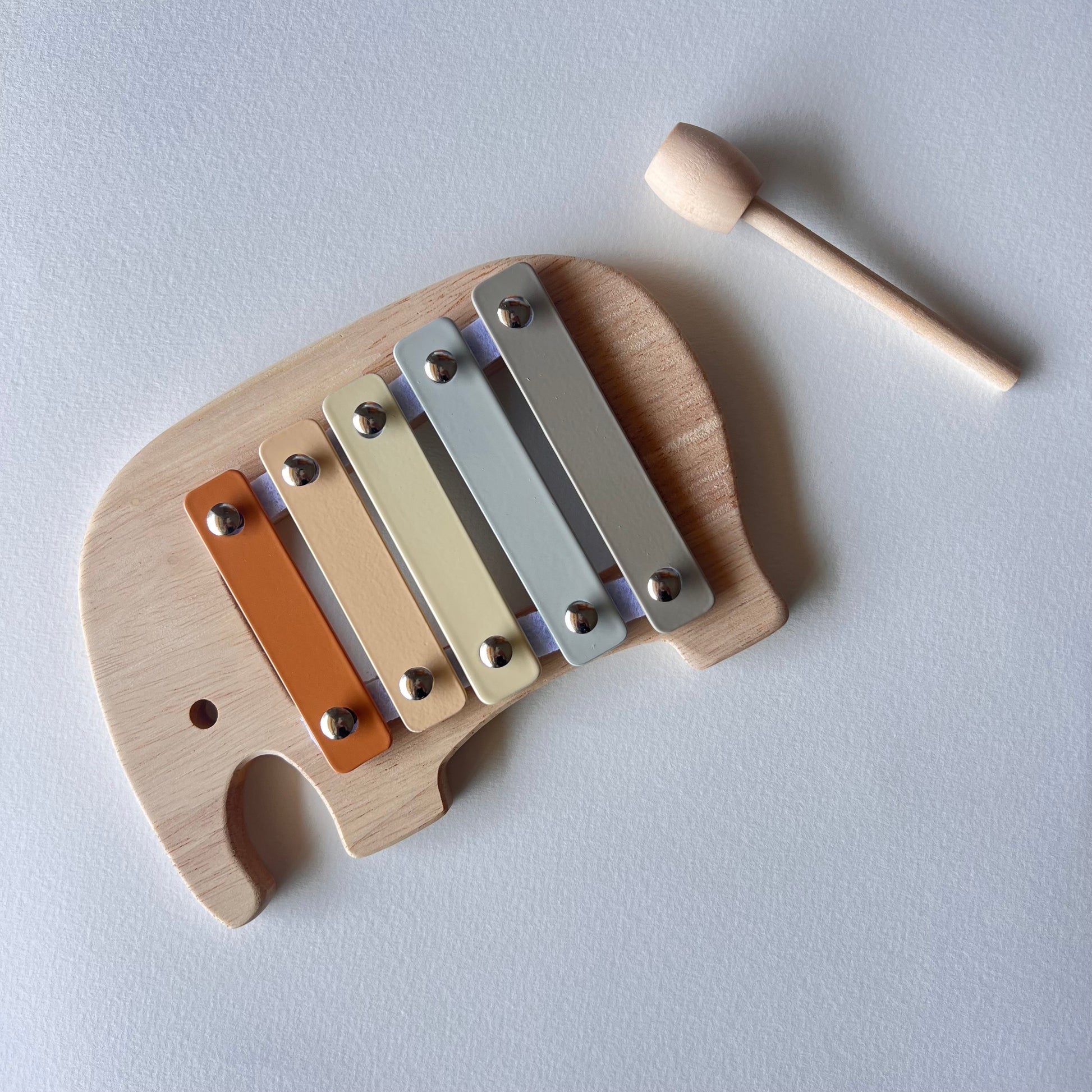 Este dulce xilófono con forma de elefante es el primer instrumento ideal para introducir a los niños en el mundo del ritmo y los sonidos. Fabricado en madera natural y láminas metálicas pintadas en tonos tierra, su diseño ergonómico y compacto lo hace fácil de sostener para manos pequeñas.